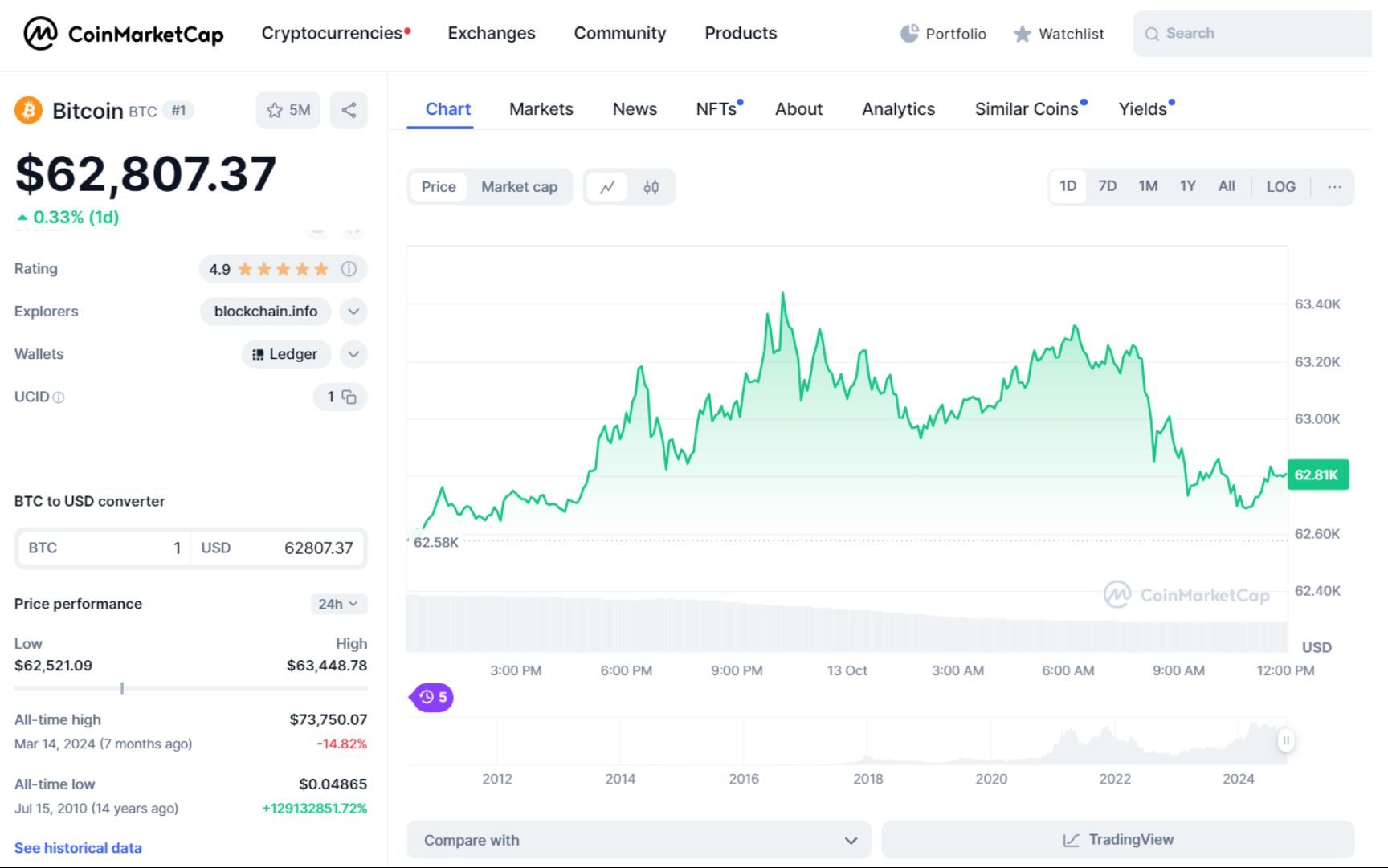 Theo dữ liệu của Coinmarket, cập nhật tới 11h15 ngày 13/10 (theo giờ Việt Nam), giá Bitcoin giao dịch ở mức 62,807.37 USD/BTC, tăng 0.33% trong 24 giờ qua.