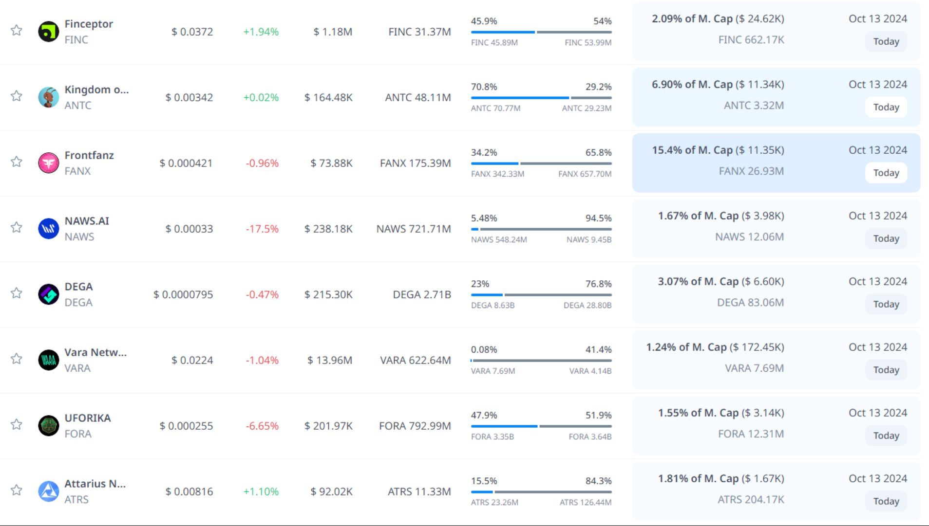 Theo dữ liệu trên Coinmarketcap tính đến 11h22 ngày 13/10, top 10 đồng tiền điện tử có giá trị lớn nhất thị trường hôm nay có dấu hiệu phục hồi như: BTC (tăng 0.38%), ETH (tăng 0.71%), USDT (tăng 0.00%), BNB (giảm 0.55%), SOL (tăng 0.35%), XRP (giảm 0.09%), USDC (giảm 0.00%), DOGE (tăng 1.43%), TRON (tăng 1.53%), Toncoin (tăng 0.95%). Theo đó TRX là đồng có xu hướng phục hồi lớn nhất ở mức 1.53%.